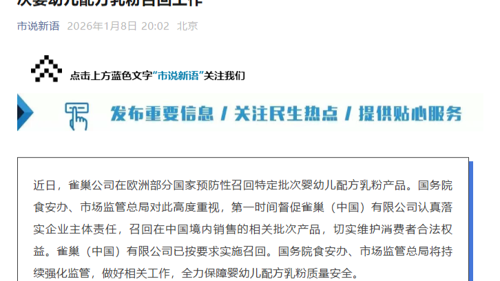 国务院食安办、市场监管总局督促雀巢(中国)有限公司做好相关批次婴幼儿配方乳粉召回工作