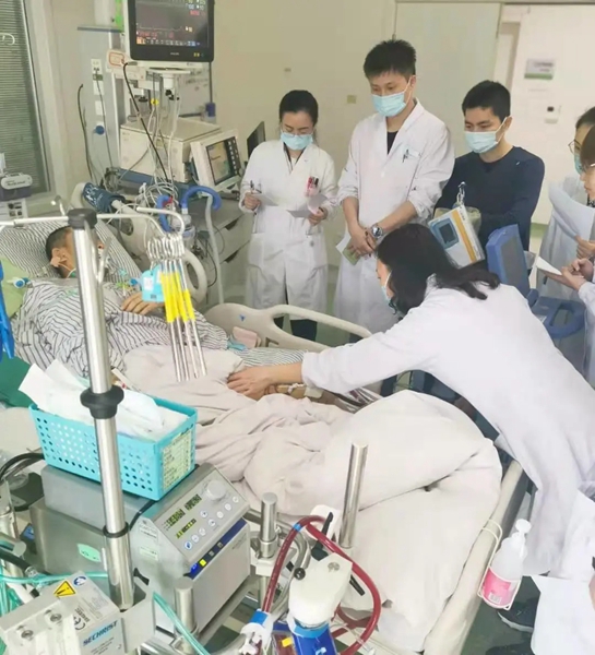 2月10日,大年三十的前一天,中大医院接到来自徐州的救援电话,患者杨某在高铁上乘车期间突发胸闷胸痛伴头晕,入当地医院抢救。室速、电复律、支架置入、主动脉内球囊反搏辅助、ECMO治疗,大剂量血管活性药物下血压依然难以维持。为争取一线生的希望,家属向中大医院发出了求救信号。接到通知,ICU莫敏副主任医师、吴昌德主治医师与护师王文春迅速集结,为能尽早赶到徐州,他们订了最近班次的高铁。当日12点接到通知,13:20要赶上火车,又逢春节返程高峰,赶往火车站最快也得40分钟。留给他们准备的时间也就20分钟,时间就是生命……莫敏带领ICU小分队火速赶往徐州当地医院,查看病人,安抚家属后果断更换新ECMO膜肺。在呼吸机、ECMO及大剂量血管活性药物等维持下,“120”急救车一路风驰电掣,从徐州奔向南京,最快时速达160公里每小时,四个小时的路程整整压缩到三个半小时,23:30,救护车警报声划破了寂静的夜空,病人安全抵达中大医院,接应的医生护士也早早守候在路口。由于车速太快,患者家属被远远地“甩”在了后面,病人急需办理入院手续,时间不等人,莫医生一路小跑,为患者垫付了住院费,护送病人做了CT,争分夺秒转入ICU病房抢救。