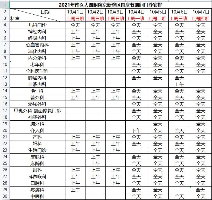 2021年南医大四附院京新院区国庆节期间门诊安排