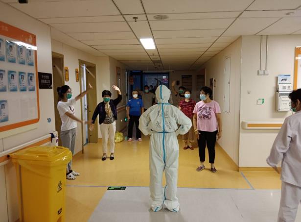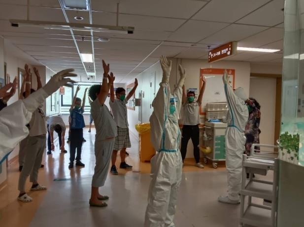 看似简单的动作,一整套下来,并不算宽敞的病房加上闷热的防护服,护士们已经气喘吁吁、汗流浃背。不过,看到越来越多的患者主动参与进来,大家一个个精神抖擞、干劲十足,护士们觉得汗没有白流,面屏后的眼角露出了微笑,口罩里的口令声也更加响亮。