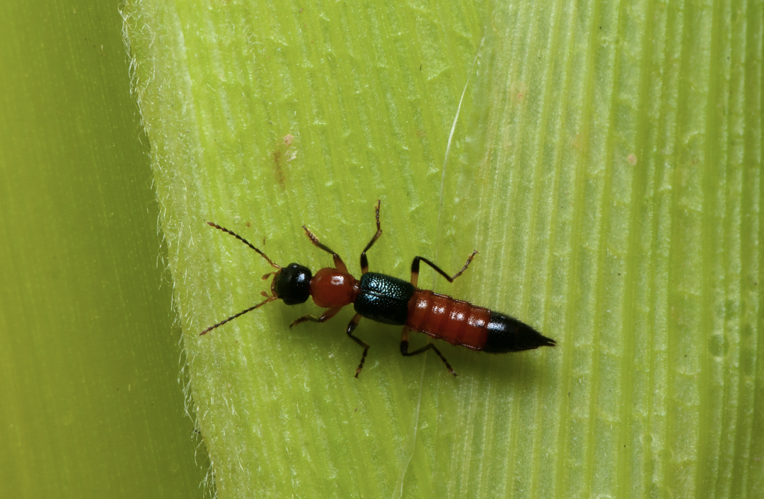 梭毒隐翅虫在外观上很好分辨,细细长长,红黑相间,头尾都是黑色。这种醒目的配色本身就是一种警戒色,向其他生物预警“我有毒,别惹我”。
