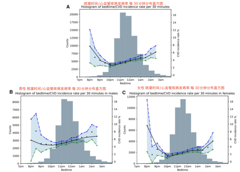 结果发现:一共发生了3172例心血管疾病,风险最低的是晚上10点–10:59入睡的那组。相比之下:
