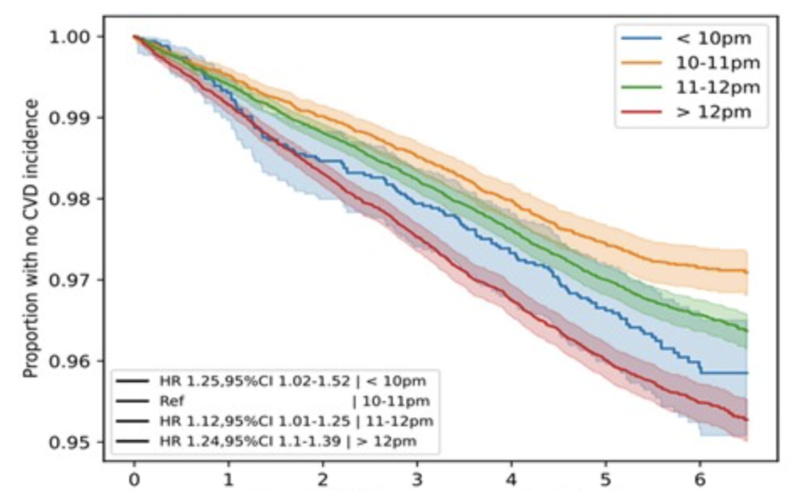 研究人员把这些人分成四组:晚上10:00前入睡、晚上10:00~10:59入睡、晚上11:00~11:59入睡和午夜后才入睡。然后,他们对参与者进行了平均 5.7 年的随访,统计谁在这段时间里新发了心血管疾病(如心梗、中风、心衰等)。
