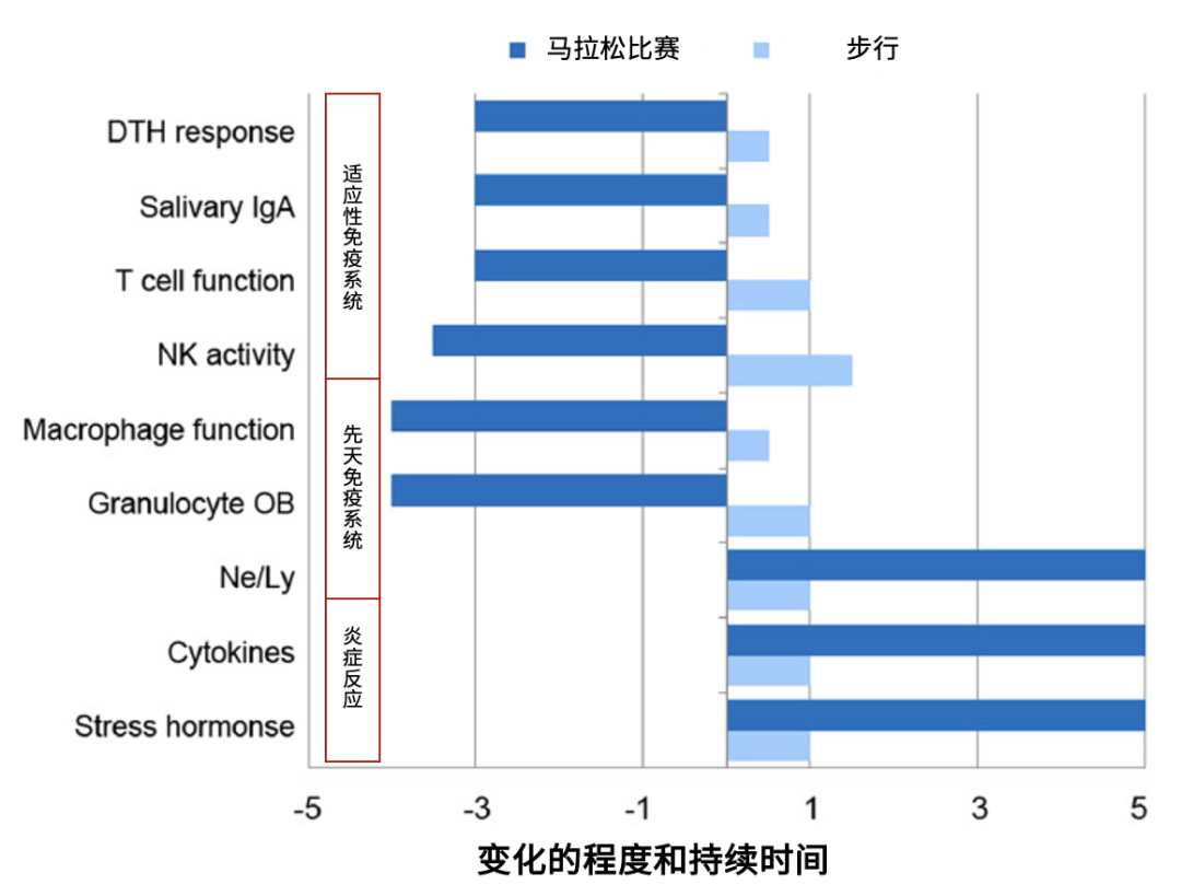 剧烈运动和步行训练后急性免疫反应的对比如下图所示: