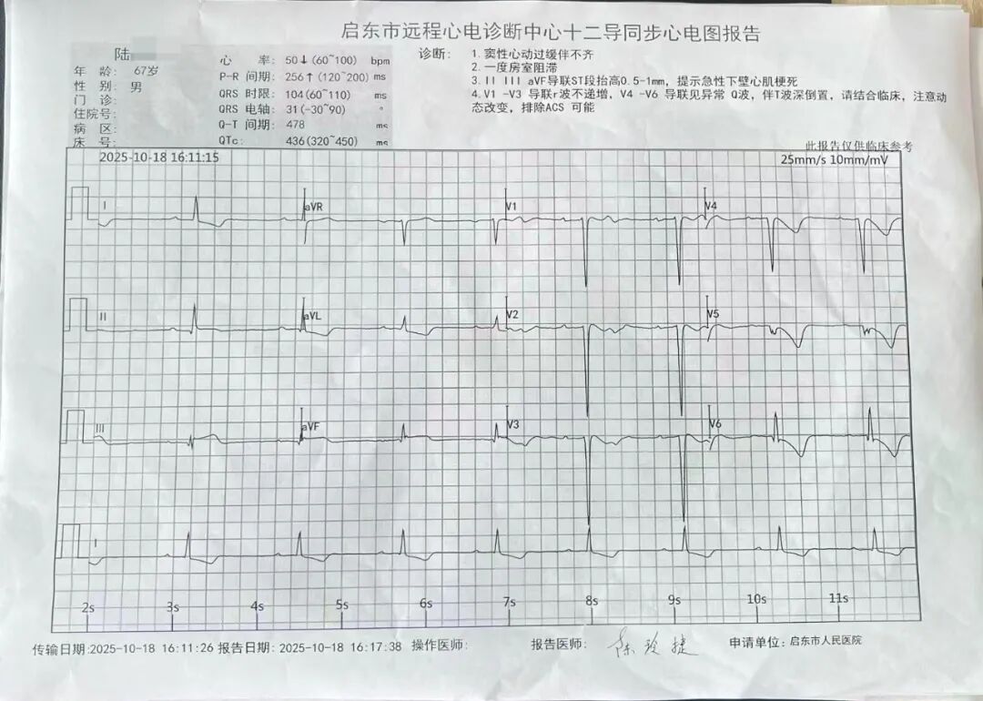 抵达医院后,急诊内科医生崔颖第一时间为陆老伯安排心电图检查。检查结果很快出来,提示“急性下壁心肌梗死”,情况危急!
