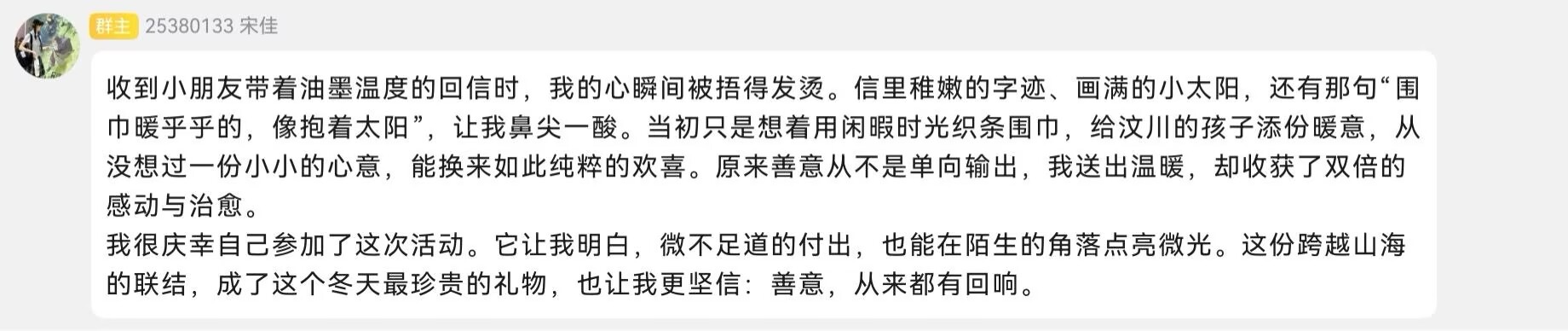 收到回信的志愿者们非常感动。2025级口腔5+3一体化班宋佳同学说:“当初只是想着用闲暇时光织条围巾,给汶川的孩子添份暖意,从没想过一份小小的心意能换来如此纯粹的欢喜。原来善意从不是单向输出,我送出温暖,却收获了双倍的感动与治愈。”