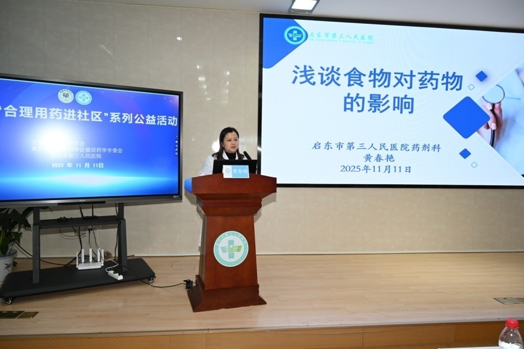 活动现场,启东市第三人民医院药剂科主任黄春艳带来《浅谈食物对药物的影响》公益讲座。她结合“头孢配酒,说走就走”等真实案例,从吸收、代谢、相互作用和排泄四个方面,深入浅出解析食物与药物的相互影响,帮助居民规避日常用药“隐形陷阱”。她呼吁,每个人都是自己健康的第一责任人,遵医嘱用药不仅是对自身安全的负责,更是对家庭幸福的守护。