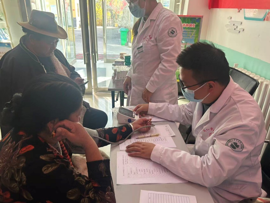 在当地,心血管、内分泌及呼吸系统等疾病高发。袁明医生始终怀着一份耐心与共情,对待每一位就诊群众——他会俯下身仔细听诊,放慢语速详细问诊,一笔一划写下清晰的处方,用通俗易懂的语言讲解高血压、糖尿病、慢阻肺等常见病的防治要点。得知部分偏远村落的老人行动不便,他便随团队翻山越岭,把诊室搬到群众家门口,为年迈的老人量血压、查身体、送药品。仅仅两周时间,他就为300余名高原群众送去了贴心医疗服务。那件沾满泥土的白大褂,那颗热忱温暖的心,驱散了高原的寒意,也拉近了与群众的距离。