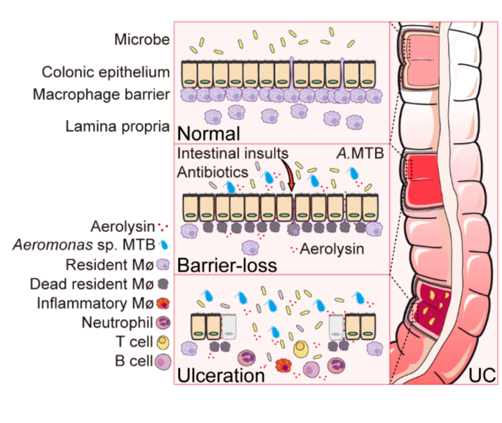 团队成功从UC患者粪便中分离出产气溶素的菌株,经基因组与生理生化鉴定为气单胞菌属新变种——MTB。该菌最令人关注的特征是其长期肠道定植能力,它像一名潜伏在肠道内的“特工”,即使在抗生素或肠道损伤后仍能隐藏自身,并在条件适宜时重新激活。这一特性为解释UC“反复发作、迁延不愈”的临床难题提供了关键答案,将微生物的持久存在与疾病的慢性过程紧密联系起来。
