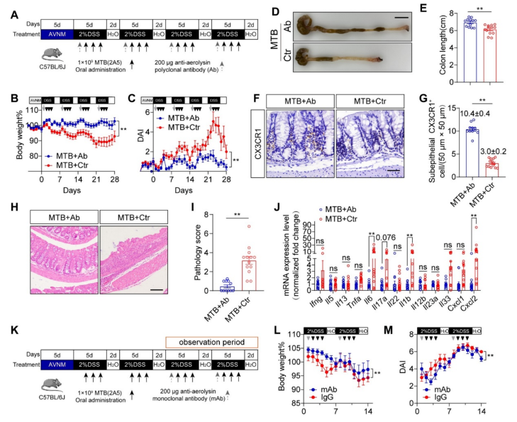 研究团队开发了抗气溶素多克隆抗体与单克隆抗体,在动物模型中取得了令人振奋的结果:预防性使用可完全阻止MTB诱导的肠炎,如同为肠道提前部署了“解毒剂”;而治疗性使用在疾病后期仍能显著缓解症状,这提示即使炎症已经发生,靶向气溶素仍然能够扭转疾病进程,展现出这一策略作为未来UC治疗的巨大潜力。