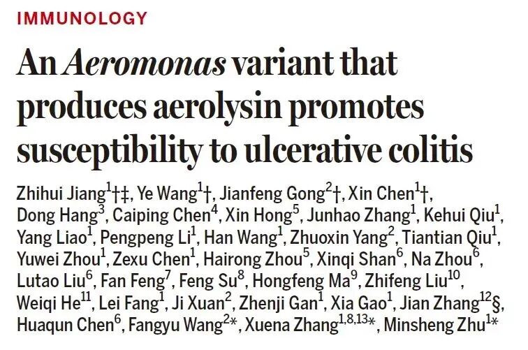 溃疡性结肠炎(UC)是一种慢性、反复发作的炎症性肠病,长期以来其发病机制不明,缺乏根治性治疗手段。2025年11月20日,南京大学医学院附属鼓楼医院作为第一作者和通讯作者单位,有关炎症性肠病的一项研究成果发表于国际顶级期刊《Science》,该研究首次揭示了一种新型气单胞菌亚种——巨噬细胞毒性气单胞菌通过产生气溶素毒素破坏肠道巨噬细胞屏障,从而驱动溃疡性结肠炎发生的关键机制。