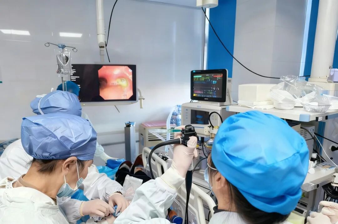 麻醉科团队以患者安全为底线,术前由汪海碧、高立群等麻醉医师完成个体化评估与核查准备,与家属充分沟通麻醉方案、可能风险与获益,逐一核对禁食禁饮、既往用药、过敏史、气道评估等关键信息,现场校准监护参数与设备,确保人、物、预案“三到位”。术中由汪海碧医师主导实施全麻+气道管理,动态调控麻醉深度与通气策略,全程监控血氧饱和度SpO₂、心率、血压等关键指标,确保镜体推进、视野清晰与操作稳定。面对气道刺激与分泌物干扰,团队反应迅速、处置果断,保障操作“稳、准、快”。术后严密监护至清醒,确认无活动性出血、无气道痉挛后,安全护送回病房,实现从“进镜”到“回房”的全流程安全守护。