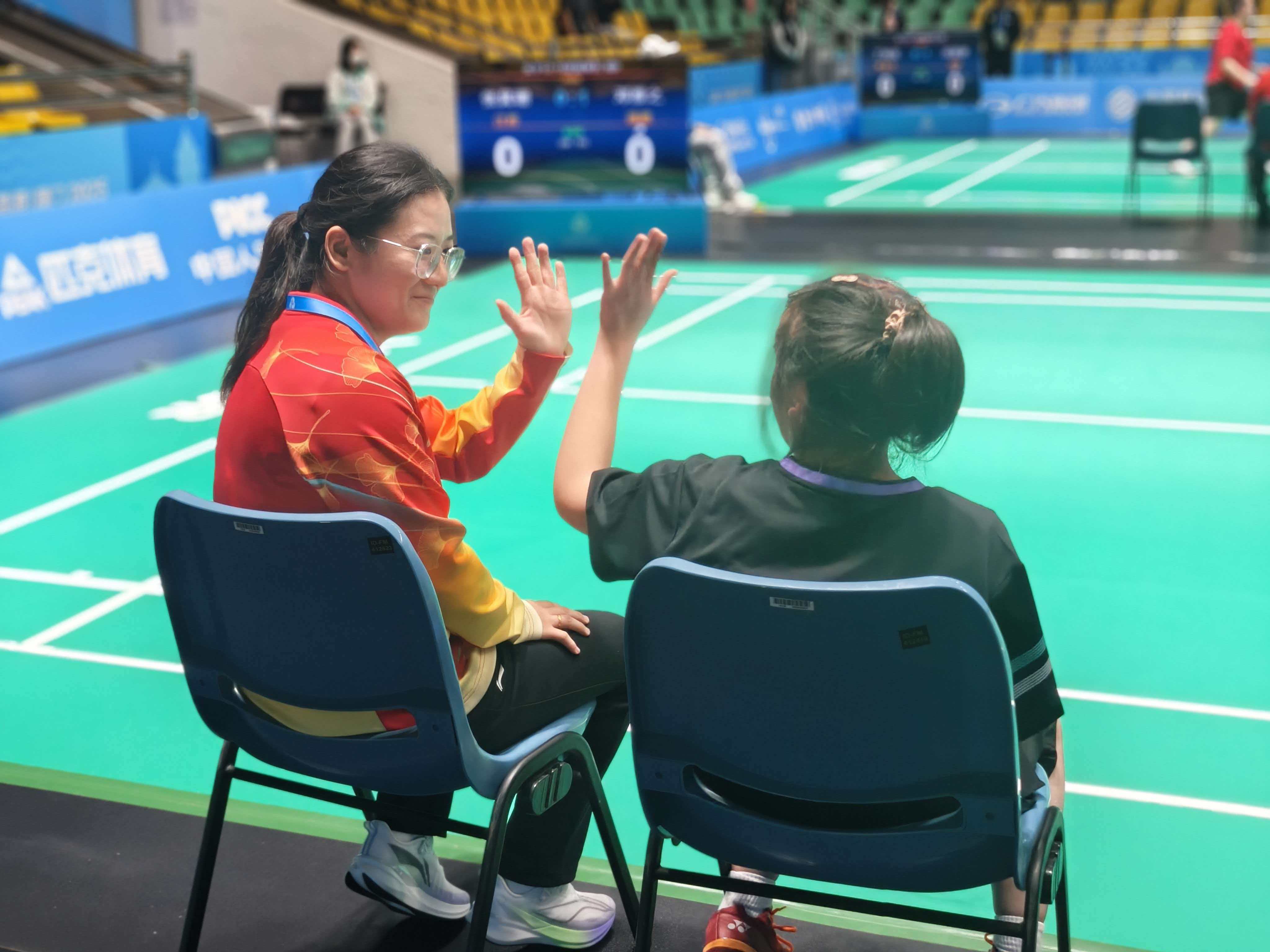 在全国第九届特殊奥林匹克运动会的羽毛球赛场里,掌声阵阵。来自江苏省淮安市第二特殊教育学校的15岁少年小高,每次击出好球后总会转头望向场边——他的“教练妈妈”陆娇,用力竖起大拇指在身边默默守护。