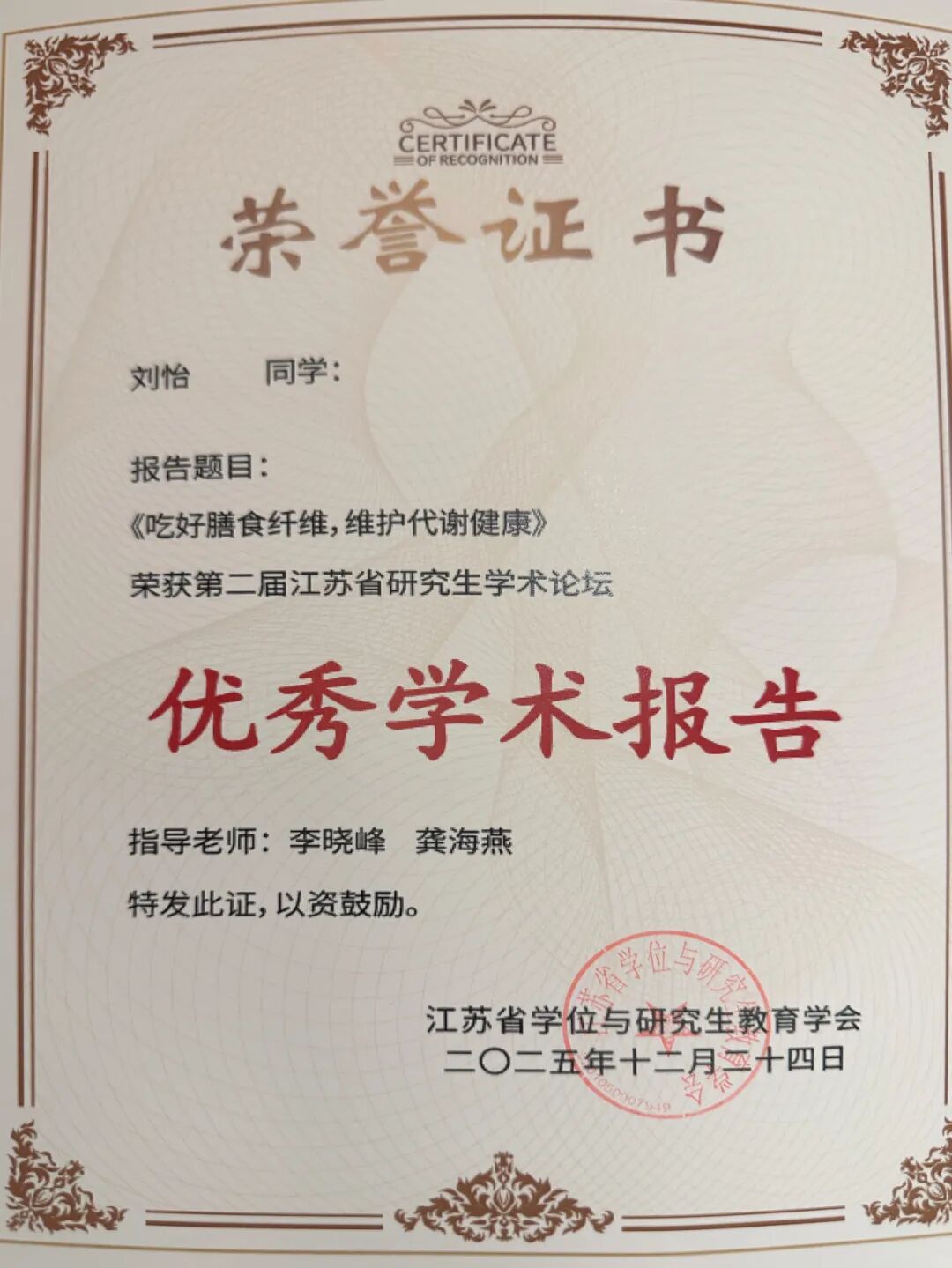 近日,由第二届江苏省研究生学术论坛在南京圆满落幕。启东市人民医院硕士研究生导师李晓峰、龚海燕指导的研究生刘怡,代表南通大学附属启东医院参赛,在平行论坛六“聚焦临床诊疗改进与医学人文”凭借题为《吃好膳食纤维,维护代谢健康》的精彩报告,在众多参赛选手中脱颖而出,斩获“优秀学术报告奖”,为学校和医院赢得了荣誉。