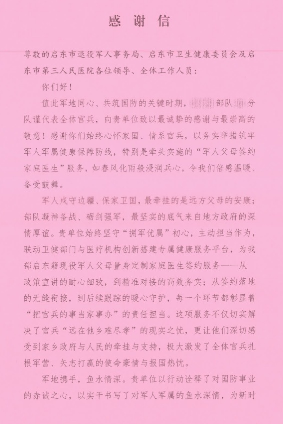 一次相聚,一纸书信,承载着深深的谢意,更凝结着浓浓的军地厚谊。市三院将继续秉承军民鱼水深情,以更优质的医疗服务,守护好军人家庭的健康,携手谱写新时代拥军优属、军民团结的温暖篇章。