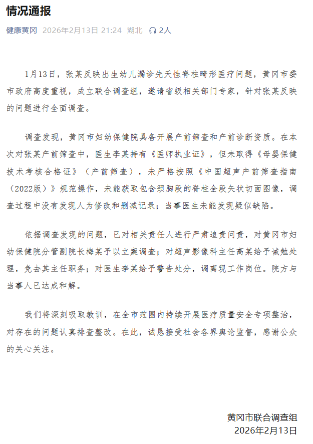 依据调查发现的问题,已对相关责任人进行严肃追责问责,对黄冈市妇幼保健院分管副院长梅某予以立案调查;对超声影像科主任高某给予诫勉处理,免去其主任职务;对医生李某给予警告处分,调离现工作岗位。院方与当事人已达成和解。