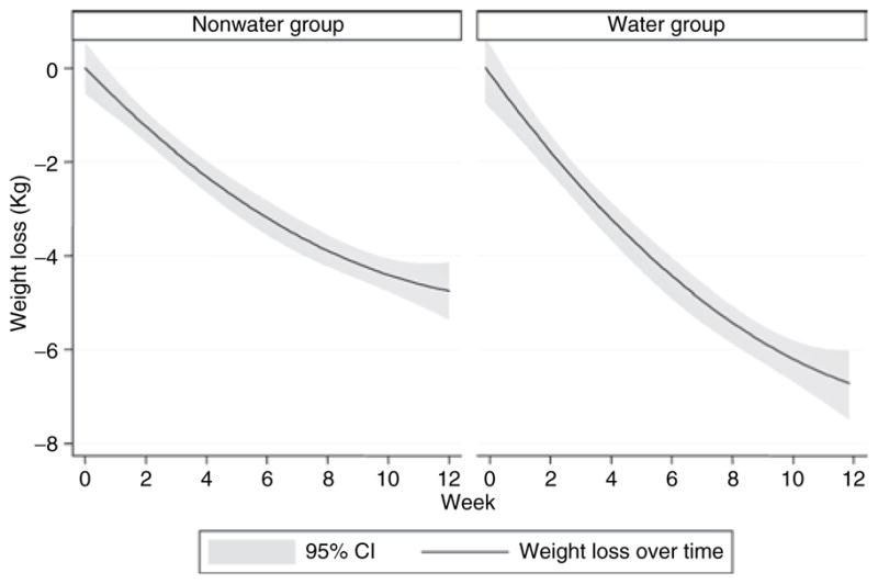 饮水组体重下降曲线(右)比非饮水组体重下降曲线(左)下降得快和深