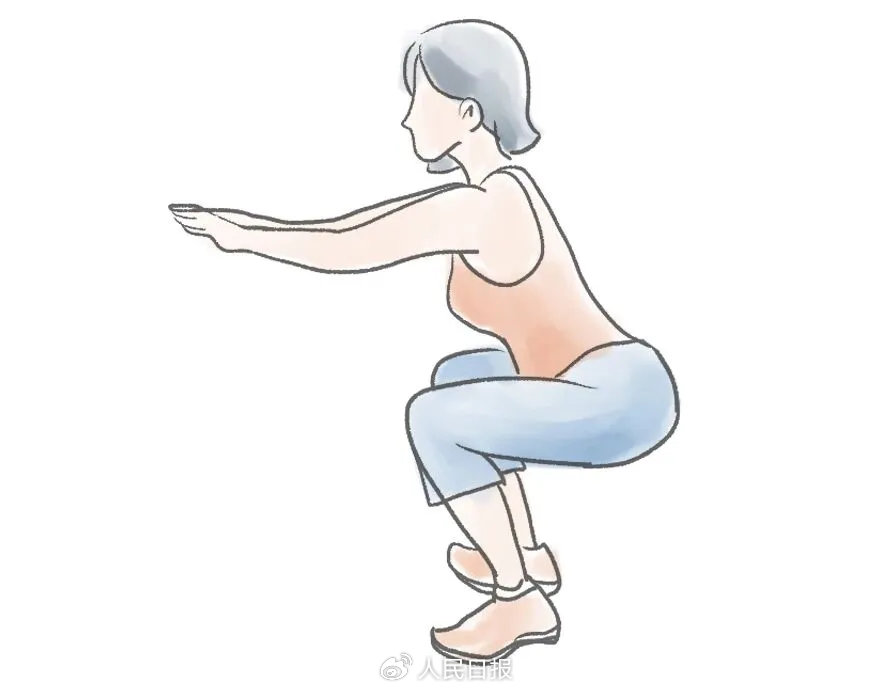 动作要点:背靠墙,双脚与肩同宽,脚尖朝前。缓慢沿墙下滑至感到大腿酸胀乏力(初学者可蹲至大腿与地面呈120°),保持小腿垂直于地面,膝盖勿内扣。蹲姿深度以不引发膝关节疼痛为前提。重心放在脚后跟。保持30~60秒/次,5~10次/组,每日2~3组。