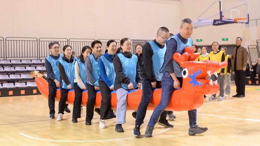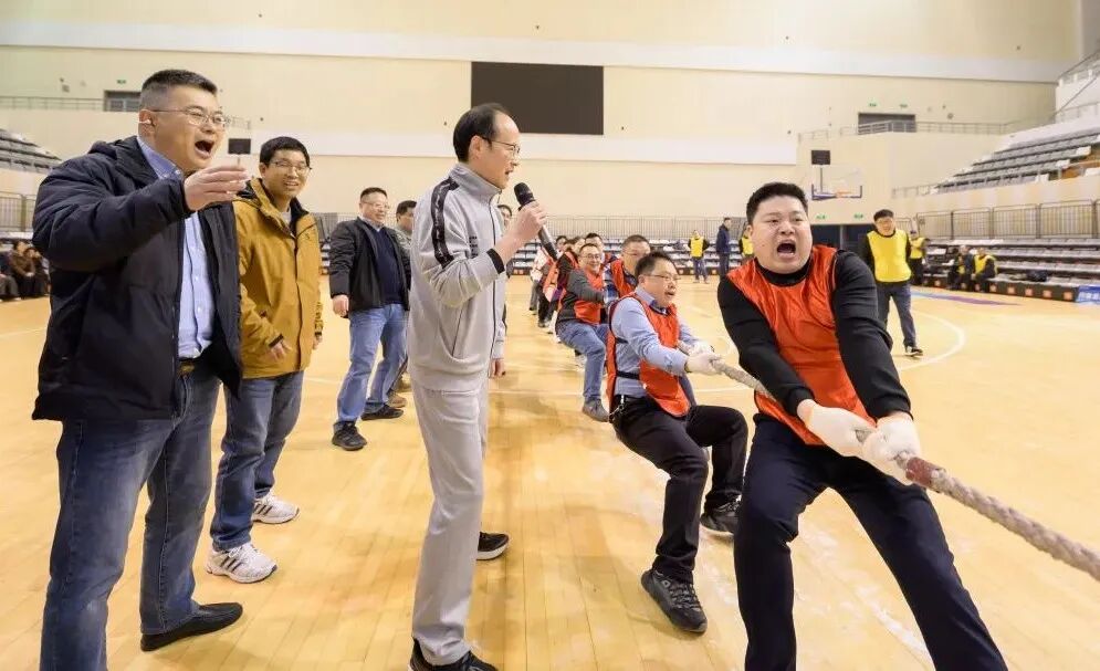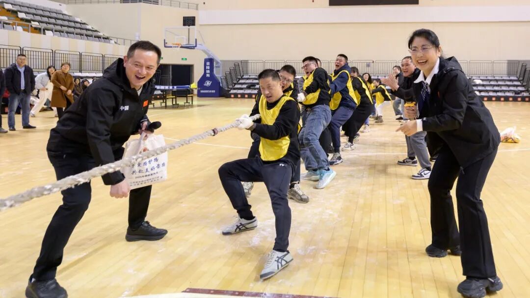 “拔河”比赛中,各队队员紧紧攥住长绳,身体后倾、齐心协力,口号声、呐喊声、加油声此起彼伏,响彻整个体育馆,每一寸肌肉的紧绷、每一次用力地拉扯,都彰显着团结的力量。