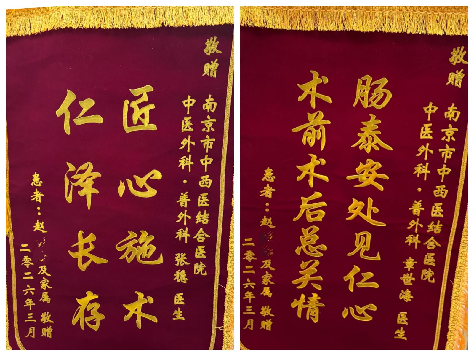 近日,两面分别印着“匠心施术,仁泽长存”“术前术后总关情,肠泰安处见仁心”的锦旗,被送到了南京市中西医结合医院普外科医护人员手中。这不仅是患者对医护团队医术的认可,更是对他们全程暖心关怀的由衷致谢,背后是一段多科协作、争分夺秒救治急症患者的暖心故事。