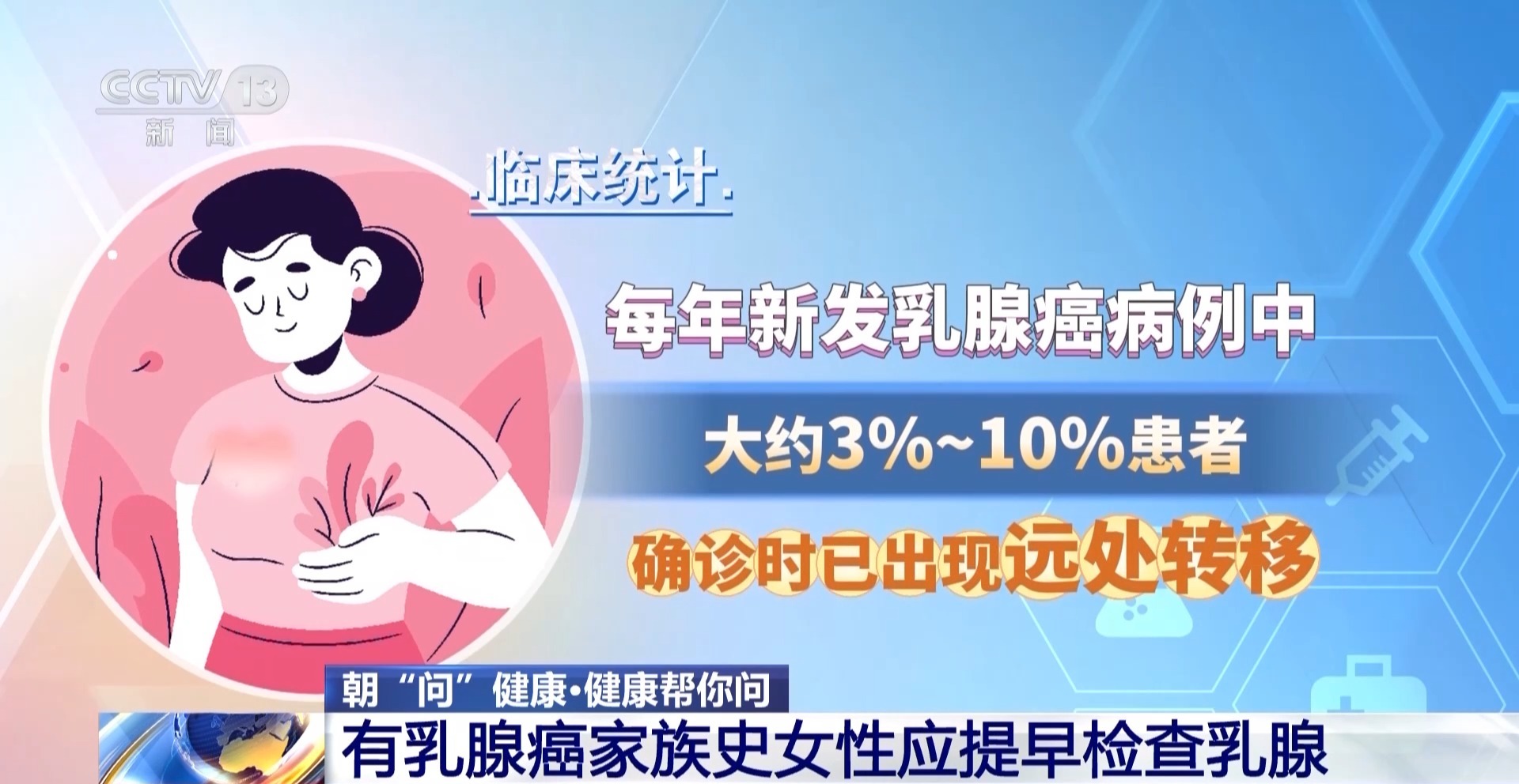 临床统计,每年新发乳腺癌病例中大约3%~10%的患者在确诊时已出现远处转移。乳腺癌发病率从20岁以后开始逐渐上升,45~55岁达到高值。专家建议,高危人群应从30岁起每年做乳腺超声检查,35岁后增加钼靶检查。普通人群可从40岁开始接受年度筛查。