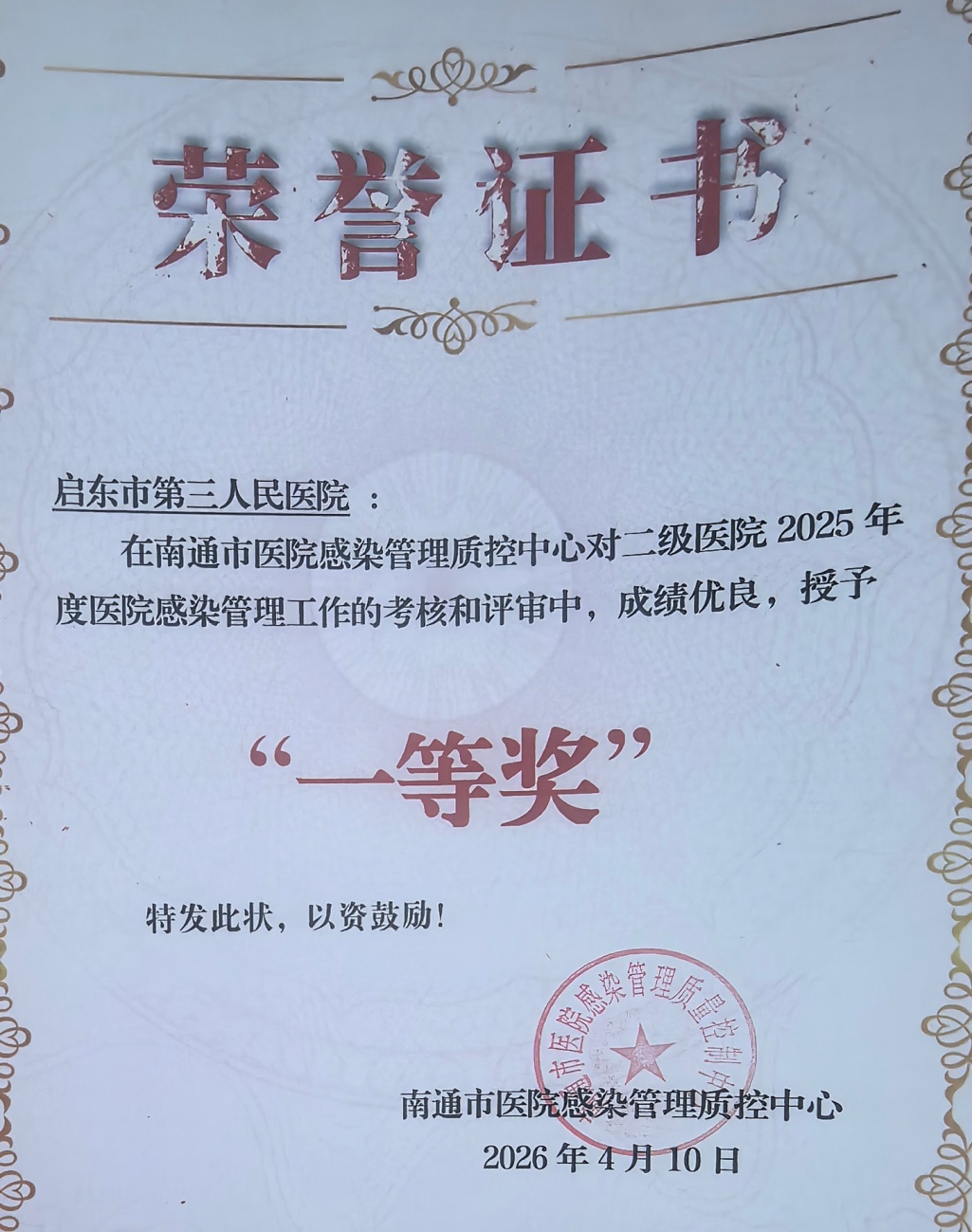 4月17日,南通市医院感染管理质控中心工作交流会议顺利召开。会上正式公布了2025年度二级医院感染管理质控考核结果,启东市第三人民医院凭借规范严谨、成效显著的院感管理工作,从多家参评单位中脱颖而出,荣获一等奖。